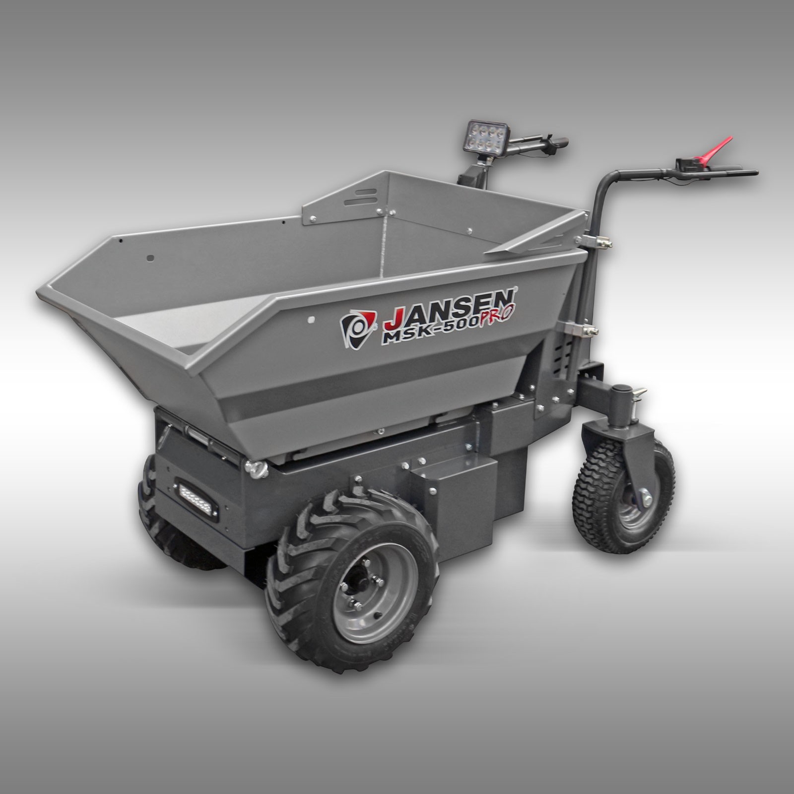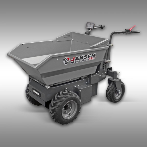 Brouette motorisée tout-terrain Jansen MSK-800X : 4x4, deux moteurs 800W, capacité 400 kg. Benne basculante hydraulique 165 L, autonomie de 6 à 8h par charge, vitesse réglable avant/arrière. Châssis compact (72 cm de large) : travail possible en intérieur, accès facile partout. Montage simple. Sécurisée : freins hydrauliques, LED, écran digital. Options :...
