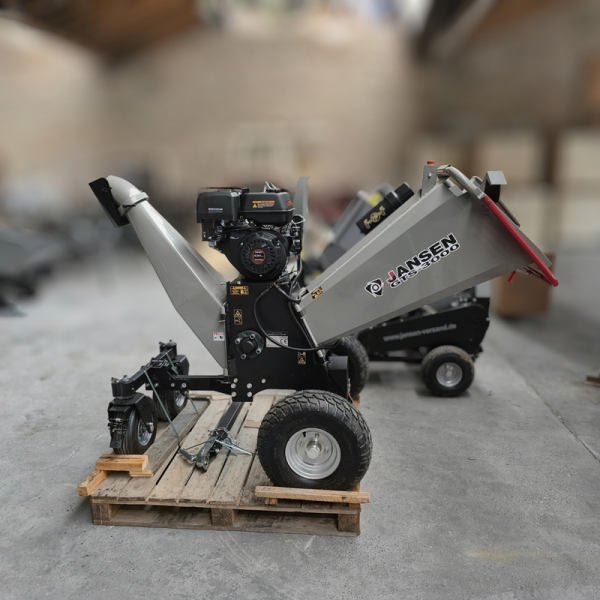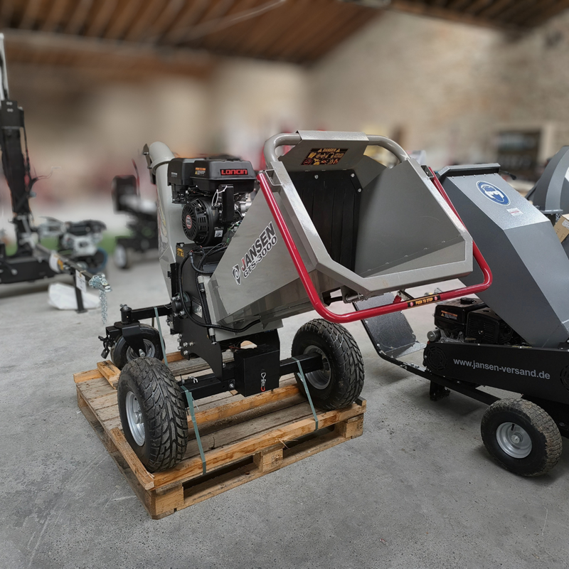 Broyeur de branches thermique professionnel Jansen GTS-1000pro – 15 CV LONCIN. Polyvalent et puissant, il réduit rapidement branches, haies et végétaux jusqu’à 9 cm de diamètre. Équipé d’un système de coupe avec affineur / post-broyeur intégré pour un broyat idéal en compost ou paillage. Démarrage manuel + électrique, éjection orientable.