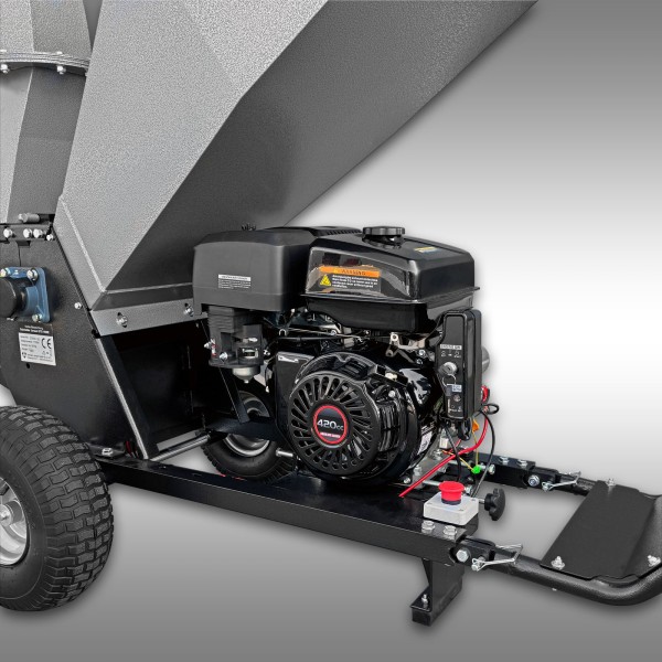 Broyeur de branches professionnel à moteur essence LONCIN 420 cm³ – 15 CV. Broie haies, branches et résidus de bois jusqu'à 12 cm de diamètre. Auto-alimentation des branches, goulotte d'éjection orientable à 180°, démarrage manuel et électrique (batterie incluse). Livré avec casque anti-bruit et lunettes de protection. Convient aussi bien aux particuliers exigeants qu'aux professionnels des espaces verts.