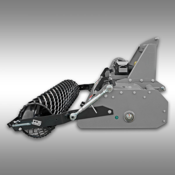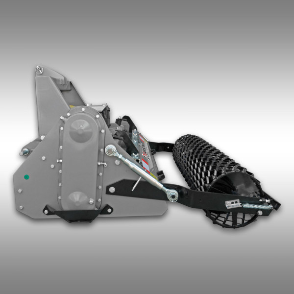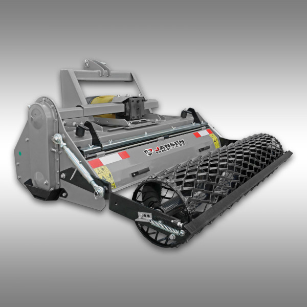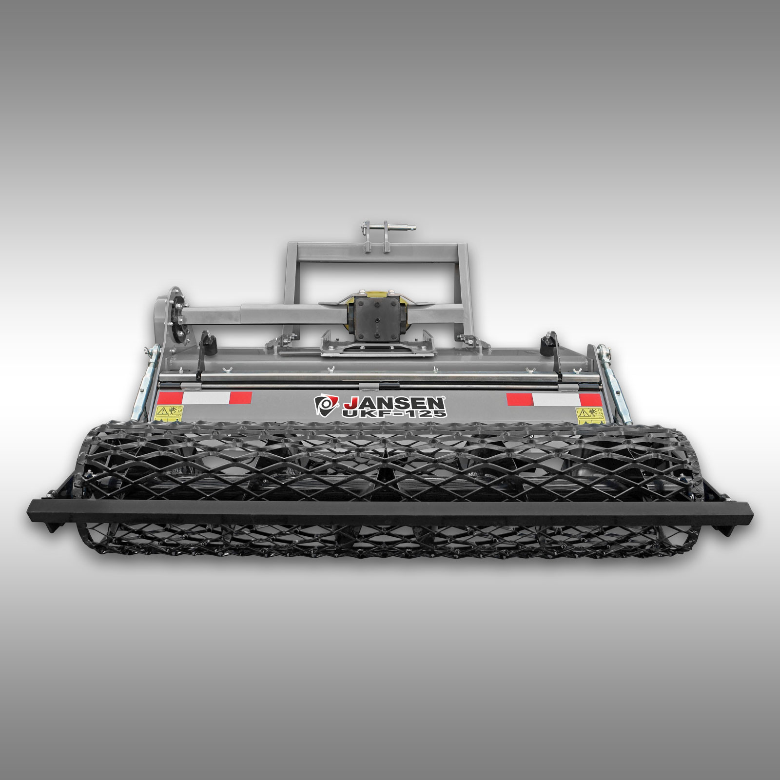 Enfouisseur de pierres Jansen UKF-145, largeur 145 cm.Préparation du sol pour gazon, maraîchage, vigne, verger ou espaces verts.Dents inversées : sépare et enfouit cailloux, racines, débris végétaux sous le lit de semence.Rouleau émietteur intégré, entraînement prise de force, montage 3 points Cat. I/II. Minimum 35 CV.