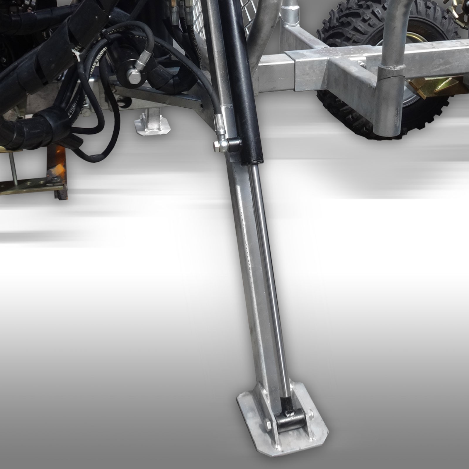 Le châssis reçoit deux béquilles hydrauliques escamotables dans le cadre : stabilité parfaite sur tout terrain.